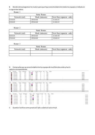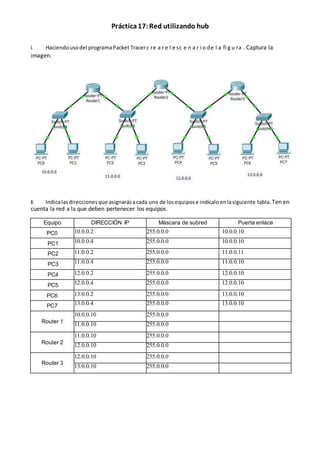 Este documento describe cómo configurar una red utilizando un hub. Explica cómo asignar direcciones IP a 8 PCs y 3 routers para dividirlos en 4 redes diferentes. También indica cómo configurar rutas estáticas en cada router para garantizar la conectividad entre todas las redes a través del hub. Finalmente, pide verificar la conectividad entre los equipos y guardar la configuración en un archivo .pkt.