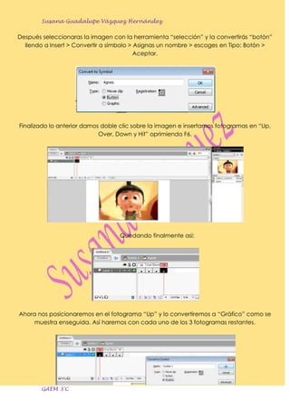 Este documento describe cómo crear un botón con efectos de color en Flash. Primero, se importa una imagen y se convierte en un símbolo de botón. Luego, se agregan fotogramas "Up", "Over", "Down" y "Hit" y se convierten en gráficos. Después, se cambian los colores y tonos de la imagen en los diferentes estados usando las opciones "Brightness" y "Tint" en Propiedades. Finalmente, se prueba el botón interactuando con el mouse.