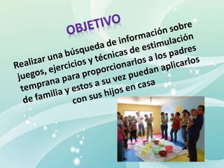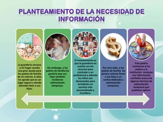 El documento describe que los padres de familia de una colonia aprecian la guardería cercana como un lugar seguro para los niños, pero les gustaría que también ofreciera estimulación temprana. La guardería carece de recursos para contratar un profesional y los grupos son grandes. Llevar a los niños a un centro especializado también es costoso. Una solución podría ser que los padres y la guardería accedan a información confiable sobre técnicas de estimulación temprana que puedan aplicar.