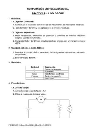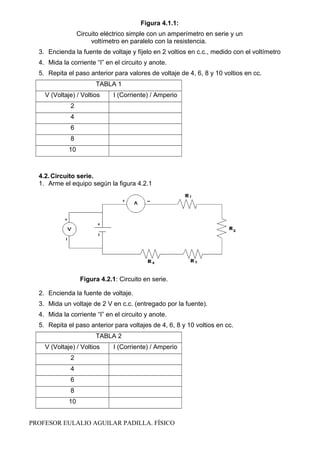 Este documento presenta un experimento para verificar la Ley de Ohm en circuitos eléctricos simples, en serie y en paralelo. Los estudiantes medirán la corriente y el voltaje en cada circuito y graficarán los resultados para derivar ecuaciones empíricas que relacionen ambas variables. Esto permitirá calcular los valores de resistencia y compararlos con las mediciones directas para determinar el error porcentual. El objetivo es familiarizar a los estudiantes con instrumentos de medición eléctrica y demostrar experimentalmente que la corriente es direct