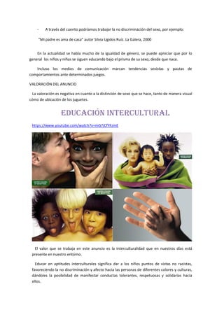 Este documento discute varios temas relacionados con la publicidad dirigida a niños, incluyendo la desigualdad de género, la educación intercultural y el consumismo infantil. Analiza anuncios publicitarios específicos y ofrece sugerencias para abordar estos temas en el aula preescolar de manera que promueva valores como la igualdad y respeto entre los niños.