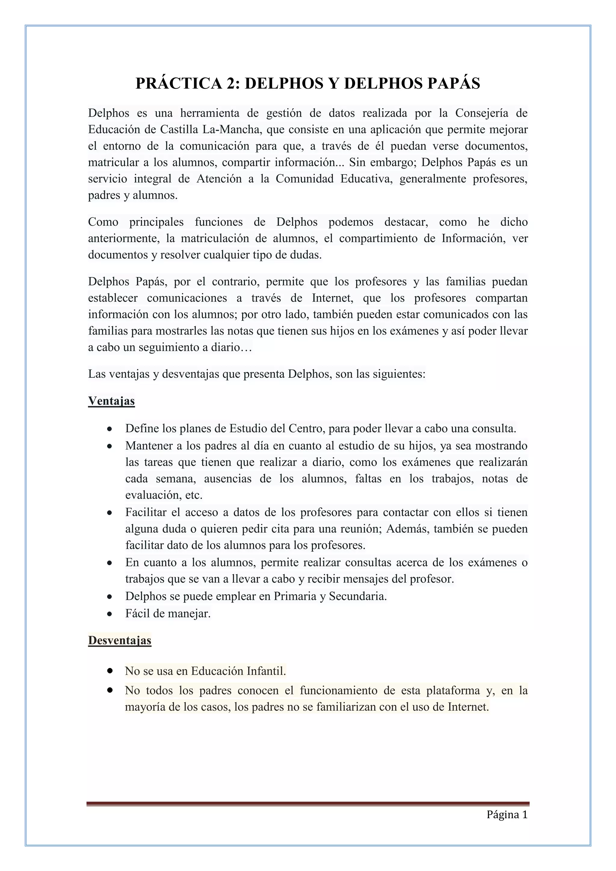Delphos es una herramienta de gestión de datos creada por la Consejería de Educación de Castilla-La Mancha que permite matricular alumnos, compartir información y ver documentos. Delphos Papás permite a profesores y familias comunicarse a través de Internet y compartir información sobre las notas y tareas de los estudiantes. Ambas herramientas tienen ventajas como facilitar la comunicación y el seguimiento académico, pero también desventajas como su falta de uso en educación infantil y la falta de familiaridad de algunos pad