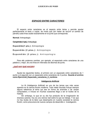 Este documento presenta instrucciones para aplicar diferentes formatos de texto en Microsoft Word, como cambiar el espacio entre caracteres, agregar bordes y sombreados, y ajustar la sangría y alineación. Explica cómo modificar estos atributos del texto a través del menú Fuente y el botón Bordes y Sombreados para resaltar secciones del documento. El objetivo es practicar estas habilidades aplicando los formatos especificados a varios párrafos.