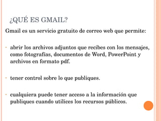 Este documento explica cómo publicar documentos en Gmail. Gmail permite abrir archivos adjuntos como fotos, documentos de Word y PDF. Para publicar un documento, se debe subir el archivo a Gmail y compartir el enlace o código encriptado. Otros recursos para publicar incluyen SlideShare y Scribd, que permiten compartir presentaciones y documentos en varios formatos.