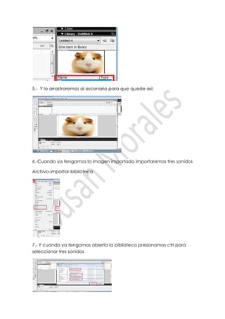Este documento describe los pasos para importar imágenes y sonidos a una biblioteca en Flash y asignarlos a fotogramas específicos en la línea de tiempo. Primero se importa una imagen y se arrastra al escenario. Luego se seleccionan tres sonidos en la biblioteca presionando Ctrl y se arrastran a fotogramas individuales en la línea de tiempo para que se reproduzcan secuencialmente. Finalmente, se configura el flujo de sonido para que se repita.