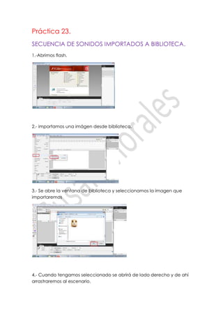 Este documento describe los pasos para importar imágenes y sonidos a una biblioteca en Flash y asignarlos a fotogramas específicos en la línea de tiempo. Primero se importa una imagen y se arrastra al escenario. Luego se seleccionan tres sonidos en la biblioteca presionando Ctrl y se arrastran a fotogramas individuales en la línea de tiempo para que se reproduzcan secuencialmente. Finalmente, se configura el flujo de sonido para que se repita.