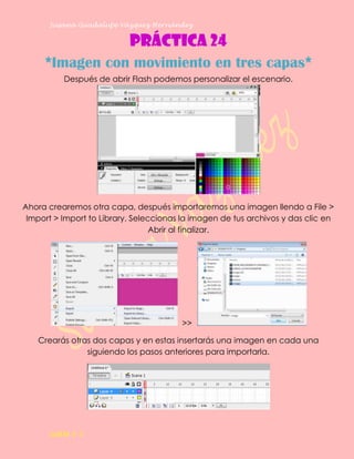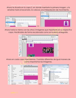 El documento describe cómo crear una presentación en Flash con imágenes en movimiento en tres capas diferentes con sonidos. Se importan tres imágenes diferentes a tres capas separadas y se les agrega una interpolación de movimiento de forma escalonada. También se importan tres sonidos diferentes a la biblioteca y se agregan a cada capa y imagen, sincronizados para reproducirse al inicio del movimiento de cada imagen.