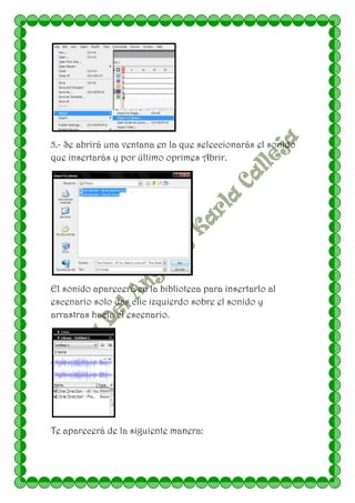Este documento proporciona instrucciones para crear una presentación con cuatro capas de imagen que se mueven de un lado a otro del escenario, cada una con un sonido diferente. Las instrucciones incluyen editar el fondo, agregar y nombrar cuatro capas, importar sonidos a la biblioteca y arrastrarlos a cada capa, y reproducir la presentación.
