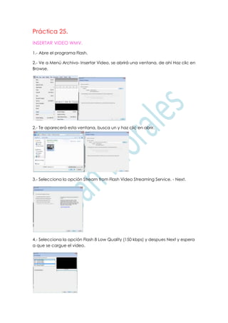 El documento proporciona instrucciones para insertar un video WMV en Flash. Indica que debes abrir Flash, ir a Archivo > Insertar Video para buscar y seleccionar el video, configurarlo para reproducirse desde el servicio de streaming de Flash a baja calidad, y reproducirlo usando el menú Control Test Movie.