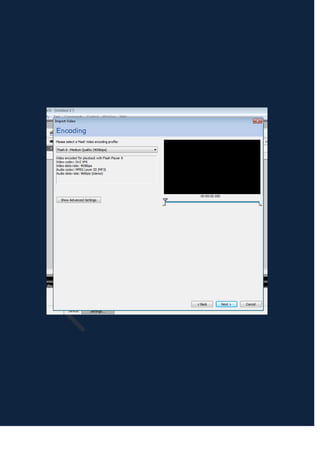 El documento proporciona instrucciones para insertar un video en formato WMV en PowerPoint. Estas instrucciones incluyen importar el video desde una carpeta, seleccionar la opción de "Stream from flash video streaming service" y configurar la calidad a "flash 8 Low Quality (150 kbps)" antes de guardar y reproducir el video en la presentación de PowerPoint.