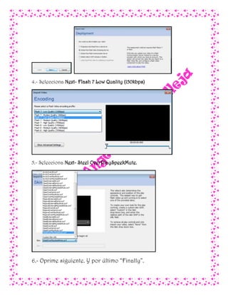 El documento proporciona instrucciones en 7 pasos para insertar un video WMV en una presentación. Estos pasos incluyen importar el video desde el menú File, seleccionar el video a importar desde el explorador de archivos, seleccionar las opciones de calidad de video y audio, y reproducir el video oprimiendo Ctrl+Enter o seleccionando Play Movie desde el menú Control.