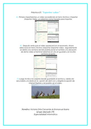 El documento describe los pasos para exportar un video en 3 oraciones: Primero, importar un video al escenario; segundo, seleccionar Archivo > Exportar Video para asignar un nombre y ubicación al video; tercero, abrir el video exportado desde la carpeta de destino usando un reproductor como Internet Explorer.