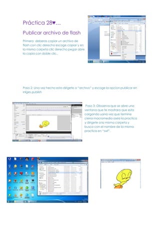 Para publicar un archivo Flash, primero se debe copiar el archivo y pegar una copia en la misma carpeta. Luego, abrir la copia con doble clic y seleccionar "Publicar en inglés" desde el menú Archivo para iniciar el proceso de publicación. Finalmente, cerrar el programa Flash y buscar el nuevo archivo publicado con extensión .swf en la carpeta.