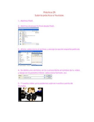 El documento proporciona instrucciones en 5 pasos para exportar un proyecto de Flash como un video AVI y luego subirlo a YouTube: 1) Abrir Flash y el proyecto final, 2) Seleccionar exportar película, 3) Nombrar el video y seleccionar formato AVI, 4) El video AVI ahora está listo para subir a YouTube.