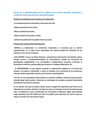 El documento discute las causas de la baja participación de los padres en las escuelas y propone medidas para mejorarla. Señala que la participación de los padres es fundamental para el desarrollo del niño, su autoestima y rendimiento escolar. Recomienda que las asociaciones de padres, los centros educativos, los profesores y las tecnologías de la información trabajen juntos para ofrecer más oportunidades de comunicación entre padres, profesores y escuela.
