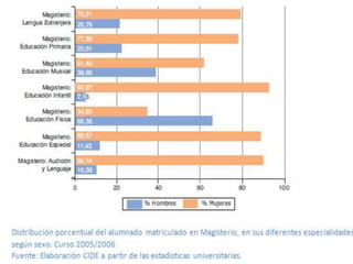 Las mujeres han alcanzado mayores niveles de educación y éxito académico que los hombres, y ya no abandonan el mercado laboral después del matrimonio. El empleo les brinda reconocimiento económico y social frente al trabajo doméstico no remunerado. Las mujeres representan la mayoría de los profesores, especialmente en educación infantil, primaria e idiomas. Sin embargo, son menos comunes en cargos universitarios de alto rango como las cátedras. En educación física, los alumnos varones superan a las