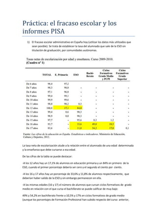 El documento analiza los datos sobre fracaso escolar en España utilizando tasas de graduación de la ESO y resultados de las pruebas PISA. Muestra que aproximadamente el 28% de los estudiantes españoles salen de la ESO sin un título, y que según PISA, alrededor del 20% de los estudiantes españoles tienen bajos niveles de competencia en lectura, matemáticas y ciencias, cifras similares al promedio de la OCDE. También compara los resultados entre las diferentes comunidades autónomas españolas y países de