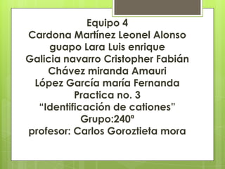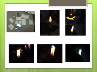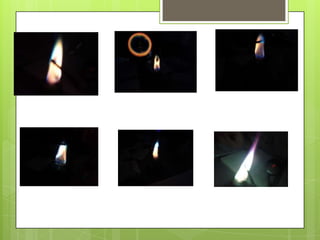Este documento describe un experimento para identificar cationes en diferentes sales a través de la coloración que producen al exponerse a la llama de un mechero. Los estudiantes observan las distintas colores producidas por cationes como sodio, calcio, estroncio, cobre, magnesio y potasio. Concluyen que las sales contienen tanto cationes como aniones y que los cationes reaccionan químicamente con el fuego, permitiendo identificar los presentes en una muestra de suelo.