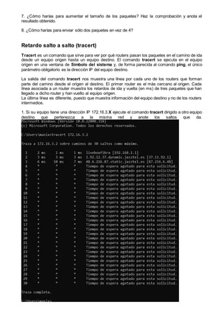 El comando ping prueba la conectividad entre dos equipos enviando paquetes de eco y midiendo el tiempo de respuesta. El documento explica cómo usar ping para probar la conectividad con un router local y un servidor remoto, notando que los tiempos de respuesta son mayores para el servidor remoto debido a la mayor distancia. También introduce el comando tracert, el cual muestra cada router en la ruta entre dos equipos y el retardo de ida y vuelta a través de cada uno.