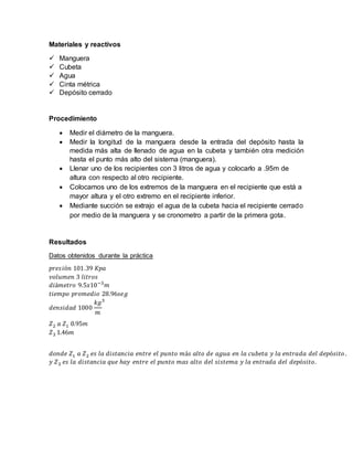 El documento describe un experimento para aplicar la ecuación de Bernoulli en la extracción de agua con un sifón. Se midieron parámetros como el diámetro de la manguera, el tiempo de extracción del agua, y las alturas entre recipientes. Usando la ecuación de Bernoulli, se calculó la velocidad del agua y se comprobó que coincide con los resultados experimentales. También se determinó la presión en el punto más alto usando la ecuación. El experimento verificó que la ecuación de Bernoulli describe adecuadamente el comportamiento del fluido en este sistema.