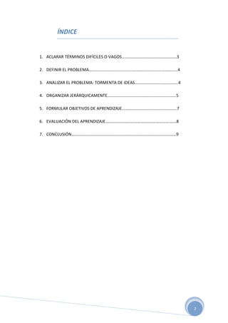 Este documento presenta un análisis del problema del divorcio y sus efectos en los niños desde la perspectiva de maestros. Propone objetivos de aprendizaje como informarse sobre cómo afecta el divorcio a los niños y cómo ayudar a padres divorciados. También incluye una tormenta de ideas sobre las consecuencias del divorcio para los niños y una jerarquización de conceptos. Finalmente, sugiere formas para los maestros de prevenir y tratar este problema.