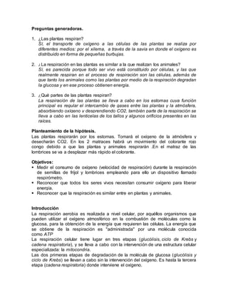 Este documento describe un experimento realizado por estudiantes para medir el consumo de oxígeno durante la respiración de semillas de frijol y lombrices utilizando un respirómetro. Los estudiantes colocaron semillas germinadas y lombrices en matraces con una solución de hidróxido de sodio y observaron el movimiento de una gota de colorante rojo congo a través de un tubo, el cual indicaba el consumo de oxígeno. Encontraron que las semillas germinadas sin hervir consumían más oxí