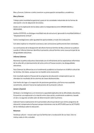 Este documento analiza diferentes teorías sobre la relación entre educación e igualdad de oportunidades desde una perspectiva funcionalista y conflictiva. Se resumen las principales críticas al funcionalismo educativo de autores como Coleman, Jenks y Boudon, así como teorías alternativas como la teoría credencialista de Collins y las aportaciones de Bourdieu sobre la reproducción cultural. Finalmente, se identifica el paso de un paradigma funcionalista a enfoques críticos sobre el papel de la educación en la reproducción de desigualdades sociales.