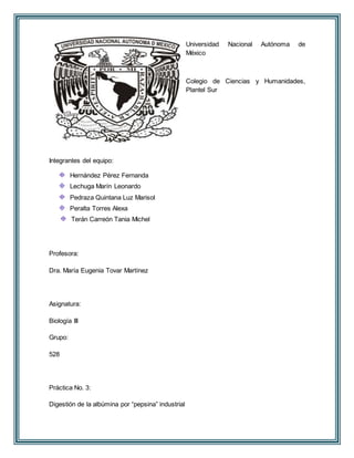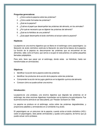 Este documento describe un experimento sobre la digestión de la albúmina por la pepsina. La pepsina es una enzima producida en el estómago que descompone las proteínas en presencia de ácido clorhídrico. El experimento muestra que la pepsina solo puede digerir la albúmina cuando está presente el ácido clorhídrico, el cual activa a la pepsina. Esto lleva a la conclusión de que la digestión de proteínas requiere de la acción conjunta de la pepsina y el