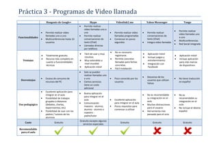 Este documento compara cinco programas de video llamada: Hangouts de Google+, Skype, Videolink2.me, Yahoo Messenger y Tango. Analiza sus funcionalidades, ventajas, desventajas y uso pedagógico. Concluye que Hangouts y Skype son las mejores opciones para integrar en el aula debido a su fácil uso, funciones completas y gratuidad, pero que la herramienta elegida depende de los recursos del centro.