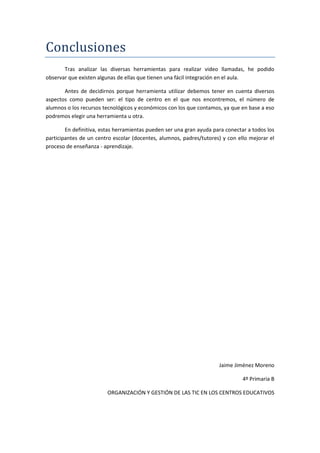 Este documento compara cinco programas de video llamada: Hangouts de Google+, Skype, Videolink2.me, Yahoo Messenger y Tango. Analiza sus funcionalidades, ventajas, desventajas y uso pedagógico. Concluye que Hangouts y Skype son las mejores opciones para integrar en el aula debido a su fácil uso, funciones completas y gratuidad, pero que la herramienta elegida depende de los recursos del centro.