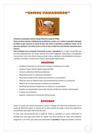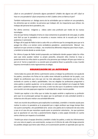 La clase visitará la panadería donde trabaja el papá de Pablo para aprender sobre la profesión de panadero. Antes de la visita, los estudiantes discutirán lo que saben sobre panaderías. Luego visitarán la panadería, donde el papá de Pablo les mostrará el proceso de hacer pan y les dejará amasar y hornear sus propios panecillos para llevar a casa.