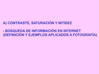 Este documento describe un experimento fotográfico para explorar los ajustes de contraste, saturación y nitidez. Se tomarán fotos de tres motivos con diferentes combinaciones de estos ajustes. Se incluyen definiciones de los términos y detalles sobre los parámetros de la cámara y las 12 tomas de cada motivo. El documento concluye presentando las fotos tomadas y comentando los resultados de cada serie.