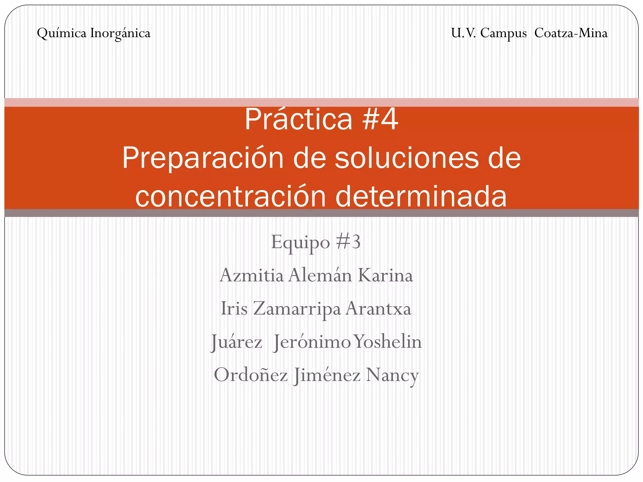 El documento presenta los detalles de una práctica de laboratorio realizada por el Equipo #3 para preparar soluciones de concentración determinada. El equipo pesó dos solutos y los disolvió en agua destilada para transferirlos a matraces aforados y completarlos con más agua. Calculó la concentración de las sustancias en porcentaje en peso, porcentaje en volumen, partes por millón, molaridad y normalidad. Las observaciones indicaron que las mezclas fueron homogéneas sin cambios de color.