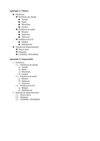El documento lista y clasifica los principales periféricos de una computadora y sistemas de almacenamiento, dividiéndolos en periféricos de entrada, salida y E/S, y enumerando ejemplos como teclado, ratón, monitor e impresora. Además, describe tres formas diferentes de organizar esta información: mediante viñetas, numeración arábiga y viñetas con imágenes.