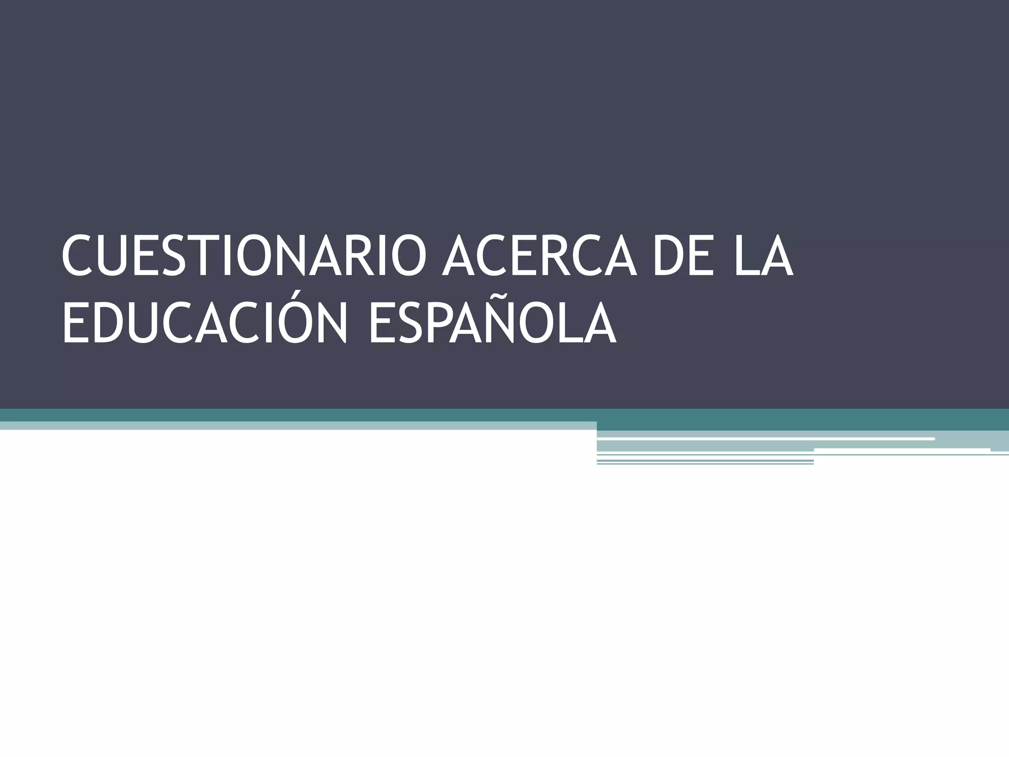 El documento presenta un cuestionario sobre la educación española que analiza los resultados de las comunidades autónomas en las pruebas PISA de 2010, la cantidad de dinero que reciben para educación, y los porcentajes de paro. Se seleccionan tres comunidades para su estudio - Castilla y León, Murcia e Islas Canarias - y se recopilan datos sobre sus resultados educativos, financiación, PIB, paro y nivel de vida. Las conclusiones no muestran una clara relación entre los factores socioeconómicos y los resultados acad
