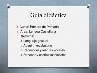 Este documento presenta una guía didáctica para el primer grado de primaria sobre las vocales. El objetivo es que los estudiantes adquieran vocabulario y aprendan a reconocer y leer las vocales a, e, i, o y u, repasando cómo escribirlas. Para cada vocal, se incluyen ejemplos de palabras y su correspondiente lenguaje de señas.