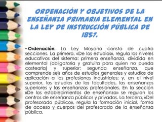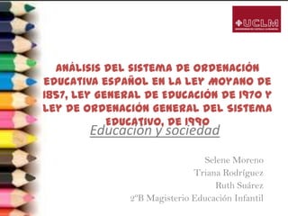 Este documento analiza la evolución del sistema educativo español a través de tres leyes clave: la Ley Moyano de 1857, la Ley General de Educación de 1970 y la Ley Orgánica de Ordenación General del Sistema Educativo de 1990. Resume los objetivos y la organización de cada etapa educativa según cada ley, destacando cómo se fue ampliando progresivamente la educación obligatoria y gratuita para toda la población.