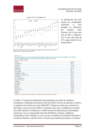 España tiene altas tasas de fracaso escolar y deserción, con uno de cada tres jóvenes que abandona la educación secundaria, según datos de la UNESCO. El documento analiza las tasas de éxito escolar en España, que rondan el 70-74%, aunque aumentan al 84% si se incluyen quienes obtienen el título a través de educación de adultos. Las tasas varían significativamente entre comunidades autónomas, desde el 89% en Asturias hasta el 61% en Baleares. Además, casi tres de