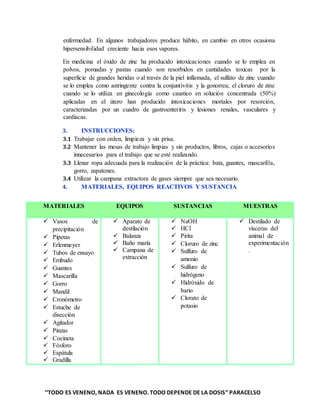 Este documento describe una práctica de laboratorio sobre la intoxicación por zinc en un pollo. Se administró cloruro de zinc al pollo vía intraperitoneal y se observó la sintomatología. Luego de la muerte del pollo, se destilaron sus vísceras para detectar la presencia de zinc mediante reacciones químicas. Se encontró zinc en las muestras a través de precipitados característicos con diferentes reactivos, demostrando que el pollo se intoxicó con zinc.