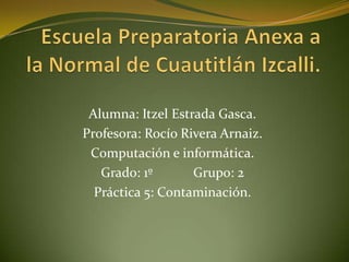 Este documento describe varios tipos de contaminación ambiental como el agujero en la capa de ozono, la lluvia ácida, los derrames de petróleo y el desastre del Exxon Valdez. Explica las causas y consecuencias de cada tipo de contaminación, así como los métodos para combatirlos o mitigar sus efectos.