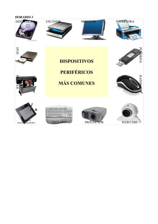 El documento presenta dos horarios escolares semanales con las asignaturas que se imparten cada día de la semana en 6 periodos, y una tabla con los dispositivos periféricos más comunes utilizados en informática como el disco duro, monitor, impresora, DVD, pendrive, ratón, teclado y proyector.