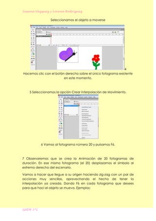 Este documento describe cómo crear una animación de mariposa en Flash mediante el uso de herramientas de dibujo o importando un clip de película. Explica cómo seleccionar el objeto, crear una interpolación de movimiento entre fotogramas, y mover el objeto de un lado a otro del escenario en zigzag presionando F6 en cada fotograma para que se mueva, resultando en una animación de mariposa.