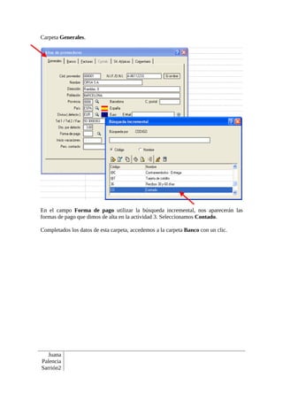 Este documento proporciona información sobre un proveedor habitual de una empresa, incluyendo su código, nombre, datos de contacto, condiciones de pago y datos bancarios. También detalla los pasos para dar de alta a un nuevo proveedor en el sistema Facturaplus, incluyendo la captura de datos generales, bancarios y de facturación.