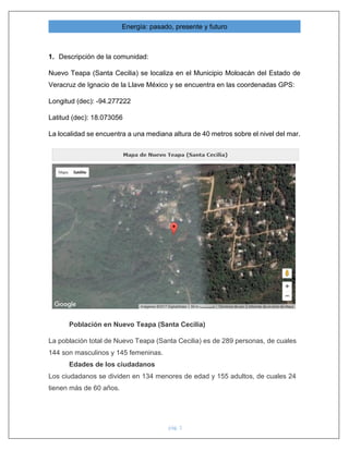 El documento describe una comunidad rural llamada Nuevo Teapa en México y analiza opciones para una transición energética sostenible. Actualmente, la comunidad depende de una planta termoeléctrica de gas natural cercana. El autor propone aprovechar el acueducto que pasa cerca para instalar equipos de generación hidroeléctrica y así proveer energía renovable a las comunidades aledañas de manera más eficiente y sostenible que la planta existente.