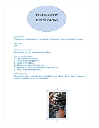 La práctica 8 describe cómo reemplazar o aumentar la capacidad de un disco duro en una computadora. El procedimiento implica desconectar la computadora, quitar la tapa del gabinete, remover los cables del disco duro existente, quitar los tornillos para retirarlo, atornillar el nuevo disco duro en su lugar, y reinstalar el software. La conclusión es que el esfuerzo de cambiar el disco duro vale la pena para aumentar la capacidad de almacenamiento.