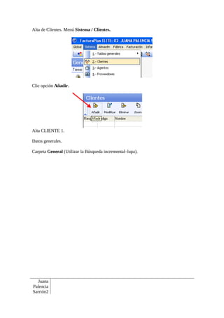 Este documento proporciona información sobre dos clientes, incluyendo sus datos generales, comerciales y direcciones. También describe cómo dar de alta a nuevos clientes en el sistema y añadir sus delegaciones.