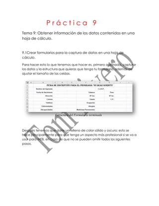 Este documento describe cómo obtener y analizar información de datos contenidos en una hoja de cálculo de Excel. Explica cómo crear formularios y tablas dinámicas, buscar y filtrar datos, y editar formularios y tablas dinámicas existentes. El objetivo es proporcionar una introducción a las herramientas de Excel para organizar, resumir y analizar grandes cantidades de datos en hojas de cálculo.