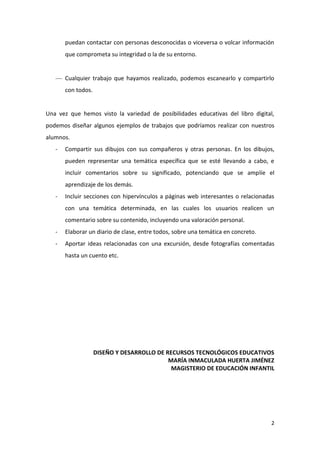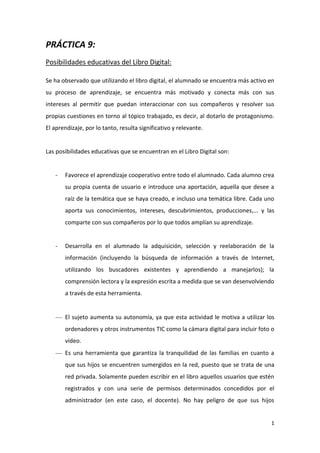 El documento describe las posibilidades educativas del libro digital. Señala que el libro digital motiva más a los estudiantes y les permite interactuar y resolver preguntas, lo que lleva a un aprendizaje más significativo. El libro digital favorece el aprendizaje cooperativo al permitir que los estudiantes compartan conocimientos e intereses. También ayuda a desarrollar habilidades como la búsqueda y selección de información, la comprensión lectora y la expresión escrita. Además, aumenta la autonomía de los estud