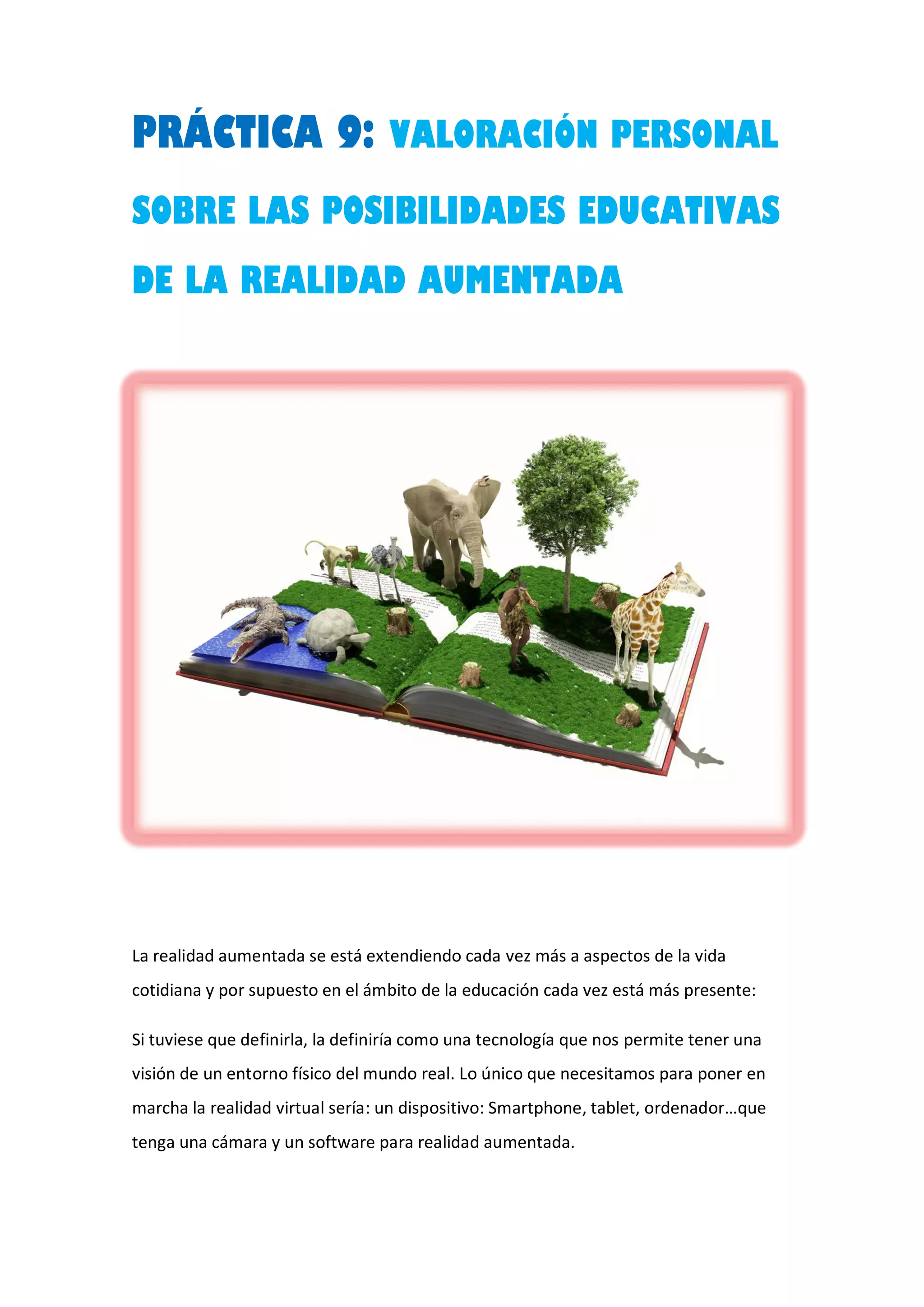 El documento describe las posibilidades educativas de la realidad aumentada. La realidad aumentada permite a los estudiantes acceder a información de una manera interactiva que mejora su comprensión. Puede usarse para hacer los libros de texto más atractivos al mostrar imágenes en 3D y diferentes perspectivas. También puede usarse en clases de geografía para que los estudiantes creen mapas con imágenes significativas y en museos para ver cuadros antes de una visita. La realidad aumentada hace que el aprendizaje sea más divertido a través de