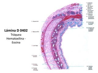 El documento describe las características histológicas de los principales componentes del aparato respiratorio humano, incluida la tráquea y los pulmones. Se proporcionan diapositivas de microscopía de la tráquea y los pulmones teñidos con hematoxilina y eosina para mostrar sus estructuras a nivel celular.